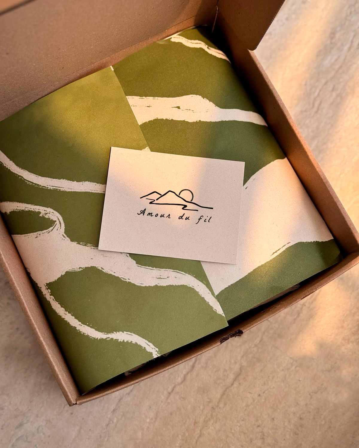L’illustration s’inspire de la Corse, terre d’origine de la créatrice : le soleil, la mer et les montagnes composent un imaginaire lumineux et naturel, au cœur de la marque. Le trait, volontairement fluide et irrégulier, évoque la singularité de chaque pièce cousue à la main.
